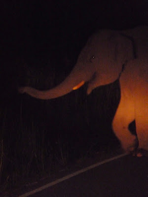 I screeched with glee as his powerful wattage revealed 2 huge beasts in the middle of the field. They were round with smooth gray skin, and had I not known we were on the search for the elephants, I would have mistaken them for boulders. To me they looked naked, and I felt like a peeping Tom flashing a light on them in their own environment. The first one (who I did not give a name for fear of attack) grumbled something and made his way closer, into the middle of the street right in front of us. Woohooo! The other stayed behind in the grass probably due to fear of anal probing, thinking our bright lights were shining from a spaceship.
