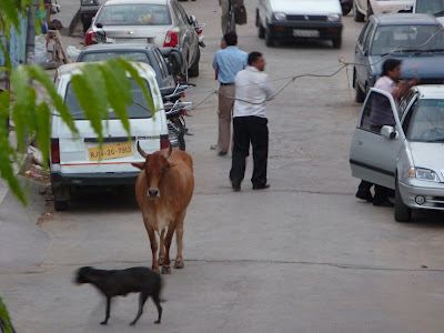 Next the fruit man and vegetable man push their carts on by, at which time the women of the street emerge and participate in their own sort of Haggling Olympics. The Bread man rides up next on his bicycle, loaves and cookies and baguettes hanging in sacks off his seat. At some point, the neighbor lady will walk her 2-yr-old around the block as well. And if we stay in the nest long enough, we’ll catch the neighborhood cow who makes her rounds about 6pm every day, stopping at the usual houses. She knows who gives the best food. I found her quite underwhelmed by my offering of 2 slices of white bread.